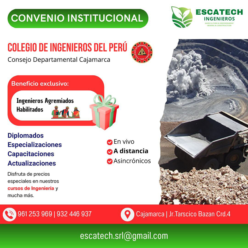 • Vales de descuento mediante sorteo para capacitaciones en Gestión y optimización en plantas de procesamiento de minerales, Gestion ambiental minera, Perforación y voladura, Restauracion ambiental minera, Cierre de minas, Especialización en sistemas de ventilación en mina, Optimización de vetas angostas de mineria.