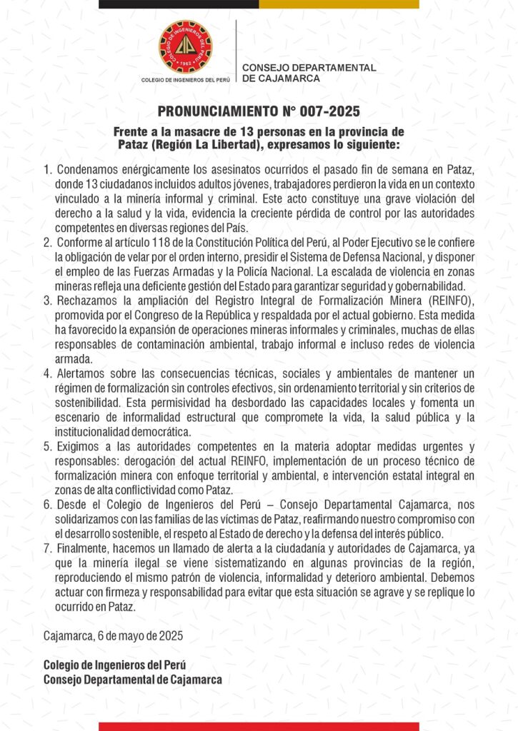 PRONUNCIAMIENTO N° 007-2025: Sobre masacre de 13 personas en la provincia de Pataz (Región La Libertad) by cipcajamarca | May 6, 2025 | Pronunciamientos | 0 comments
